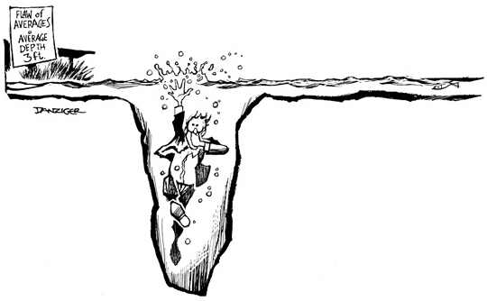 A fine example of the flaw of averages involves a 6 ft. tall statistician who drowns while crossing a river that is 3 ft. deep on average.