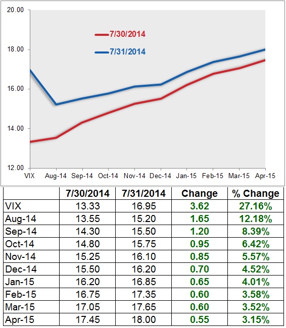 The chart and table below from Russell Rhoads at VIX Views shows an interesting visual of yesterdays increase in the VIX spot index and its futures. The chart is the VIX term structure for the VIX futures. The blue line is yesterdays term structure and the red line the day before. A term structure chart shows how the futures are priced over time. Notice the bottom goes from from left to right August 2014 to April 2015. That corresponds to the table below it, which shows the VIX (spot index) and then each months futures starting with August 2014 (the front month).