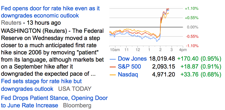 So, I’m guessing most people would expect if the Fed signaled they are closer to a rate hike the stock and bond markets would fall. Rising interest rates typically drive down stocks along with bonds. Not the case as of 3pm today. Stocks were down about -1% prior to the announcement, reversed, and are now positive 1%. Even bonds are positive. Even the iShares Barclays 20+ Yr Treas.Bond (ETF) is up 1.4% today.