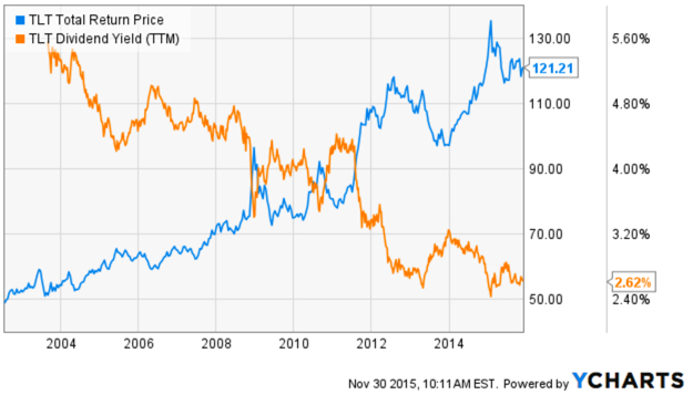 If you bought the long term U.S. Treasury index via the iShares 20+ Year Treasury Bond ETF (Symbol: TLT) about 12 years ago your yield is around 5% and the total return has been 100%.
