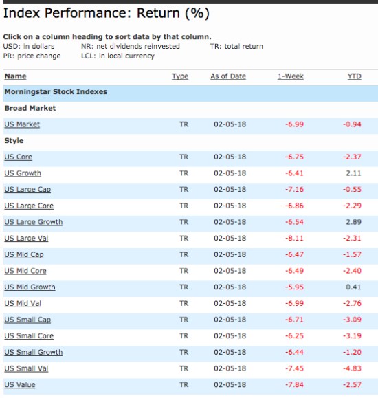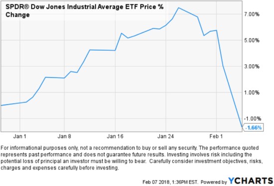 The popular U. S. stock indexes closed in the red for the year Monday, erasing their big starting gains in January. As I mentioned many times; quick gains can be lost even faster. The financial news has mostly been quoting the Dow Jones Industrial Average because it had gained the most year-to-date. It had gained over 7% in January, but lost that gain, and then some, in two days. After just a few days, the Dow Jones dropped -14% in the futures market and -8% on a closing basis. That was enough to wipe out recent gains and mark the index down nearly -2% for the year.