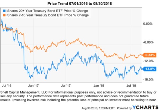 The interest rate was only 1.5% in July 2016. Since then, interest rates have already trended up to 2.82%. How has that 1.32% increase impacted the price of the bonds?