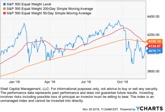 The equal weight S&P 500 has much more exposure to small company stocks. The S&P 600 small-cap index had already achieved a “death cross” when its 50-day moving average crossed below the 200 day recently.