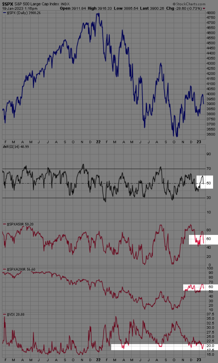 At the recent high, 60% of the stocks in the index were trending above their 200-day average and about 80% of the stocks were trending above their 50-day average, both of which have now turned down as an increasing number of stocks are trending down.