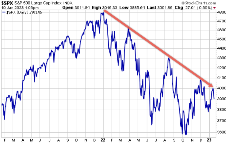 The U.S. stock market as measured by the S&P 500 stock index, has trended down from a lower high.