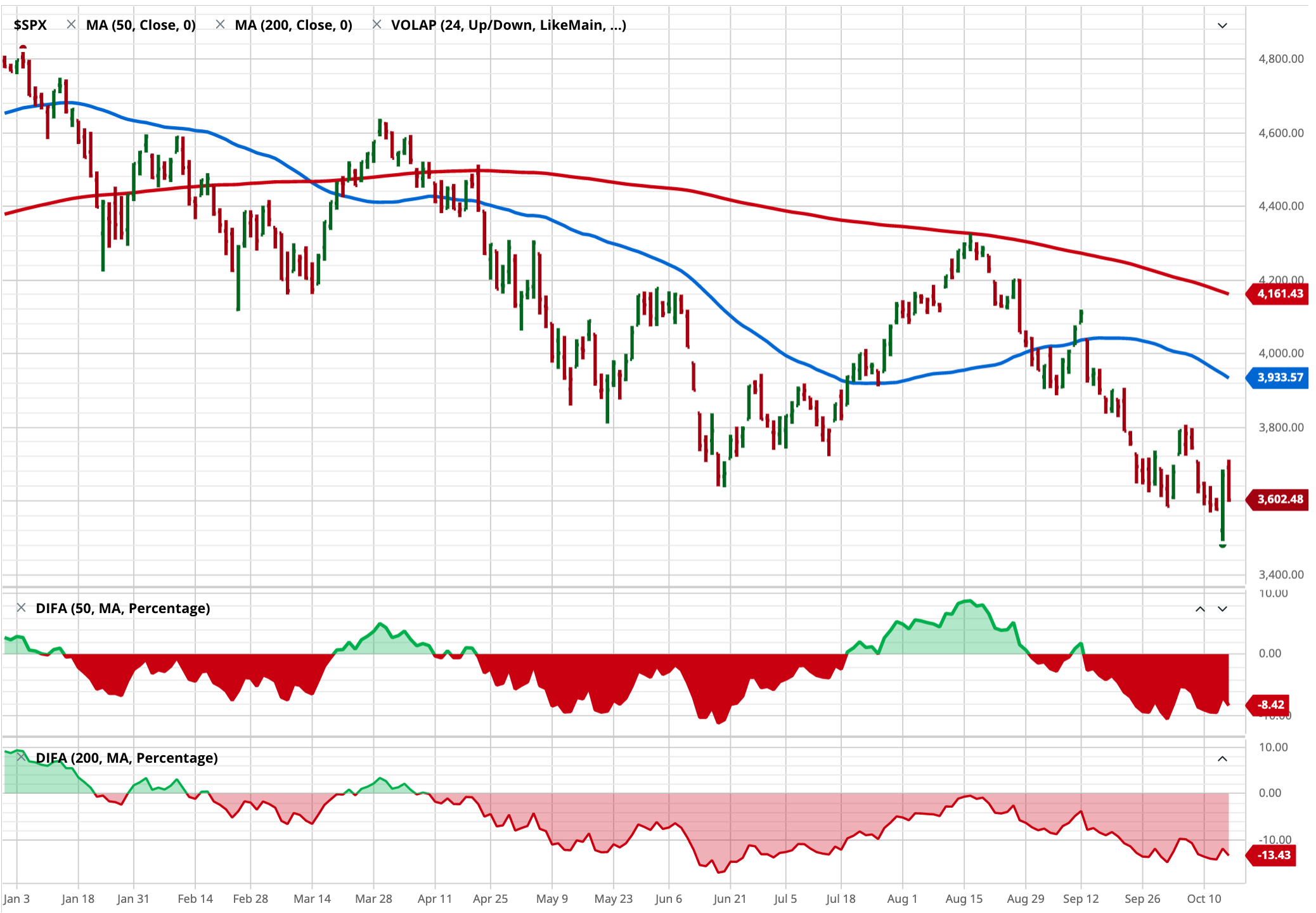 In the chart, we show the index is about 9% below its 50-day average and 14% below the 200-day average. These simple trend-following indicators have signaled defense most of the year, and you can see the red when they’re underwater.