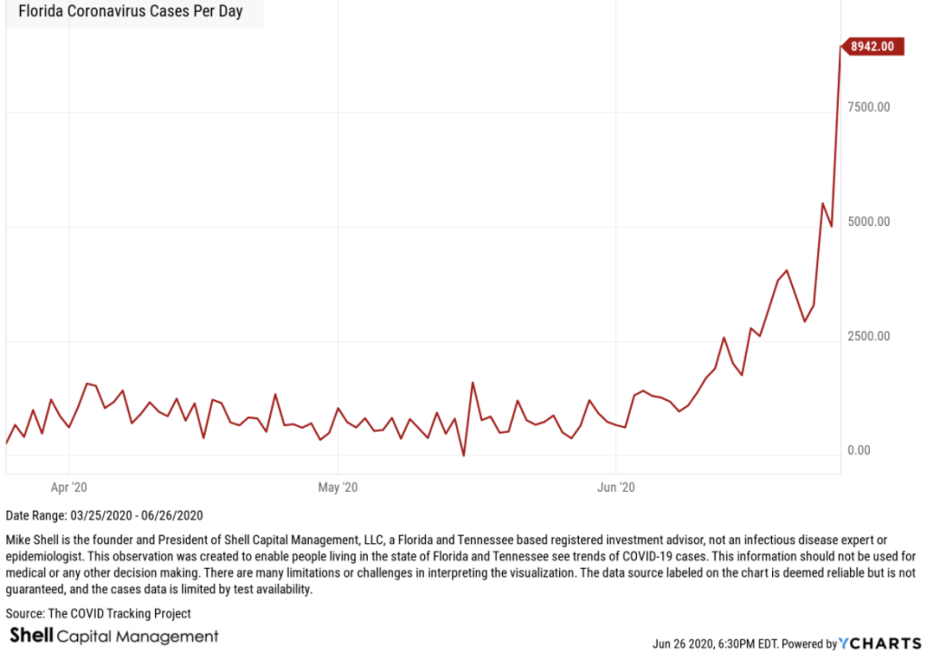 I just got an updated data feed for today. Florida Coronavirus Cases is at a current level of 122,960, up from 114,018 yesterday, and a change of 7.84% from yesterday. Cases increased by 205% this week and 1,050% over the past 30 days.
