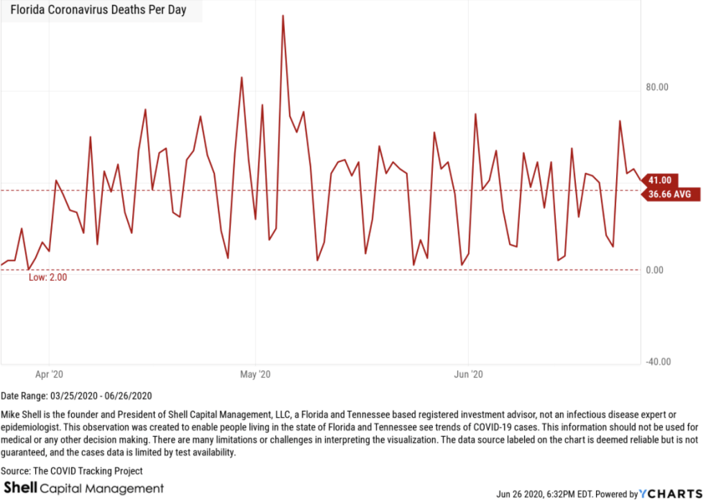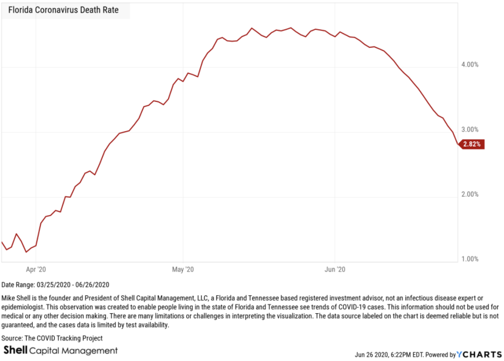 The death rate for Coronavirus in Florida is declining, but it’s too early and we don’t have a large enough sample size to draw a statistical inference from it just yet. We hope to see the death rate stay this low.