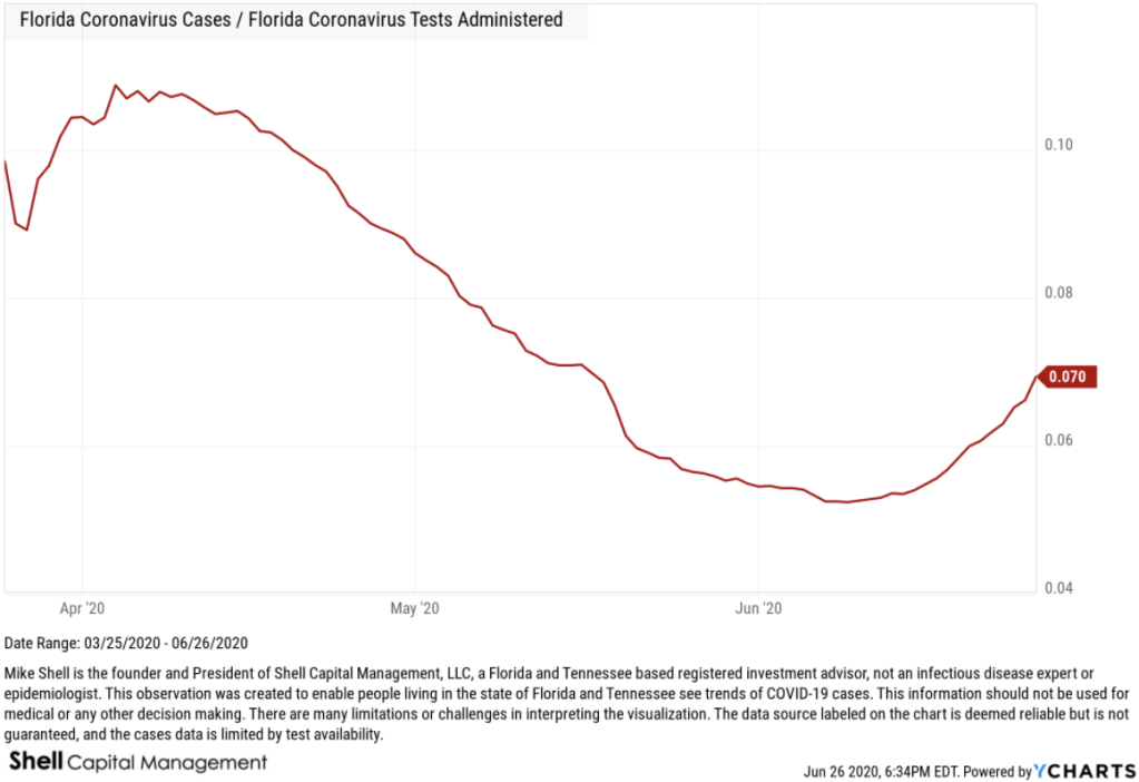 Cases relative to tests administered shows us the ratio between the two. As this trend bottomed June 9th and has seen trended up, it tells us the cases relative to tests is increasing. In other words, new cases are showing more momentum than new testing.