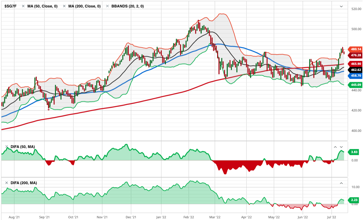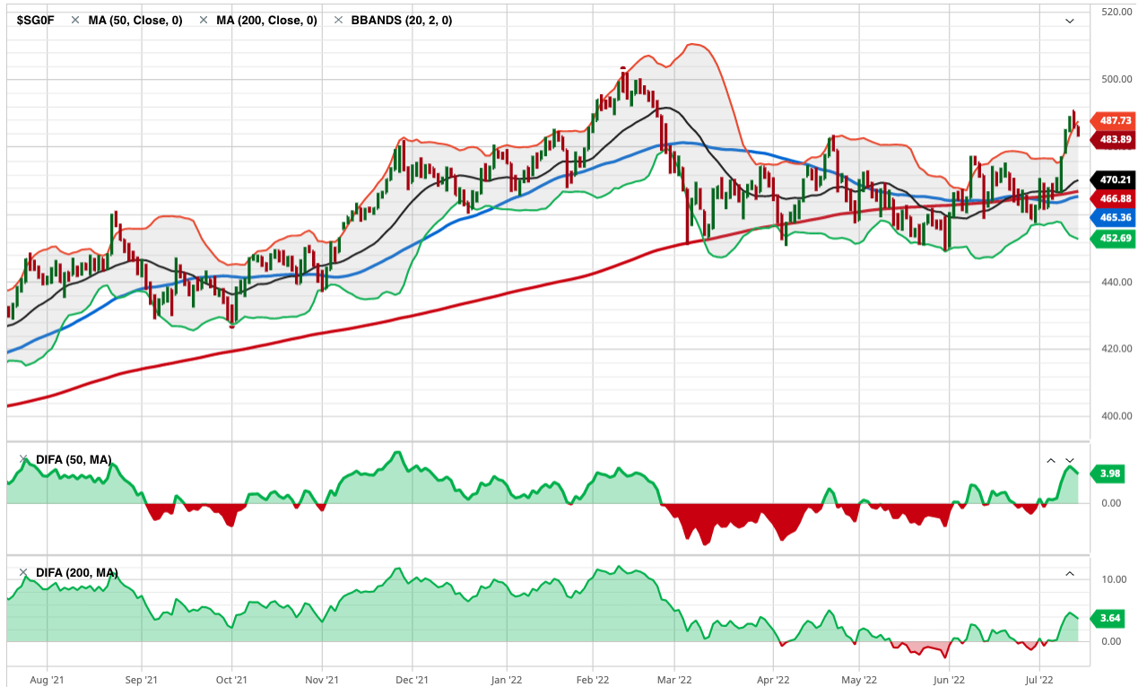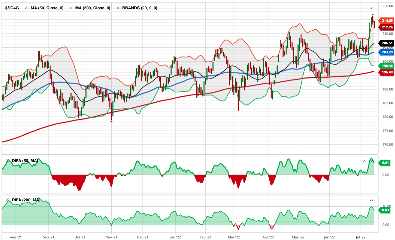 The S&P GSCI Feeder Cattle Index provides investors with a reliable and publicly available benchmark for investment performance in the feeder cattle market. S&P GSCI Feeder Cattle Index is in an uptrend as defined by above the 50 and 200-day moving averages. In fact, in the lower two frames, I include the percent above or below the 50 and 200-day average, and Feeder Cattle is about 5% above its 50-day average and 8% above its 200-day average price.