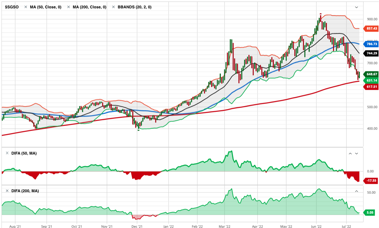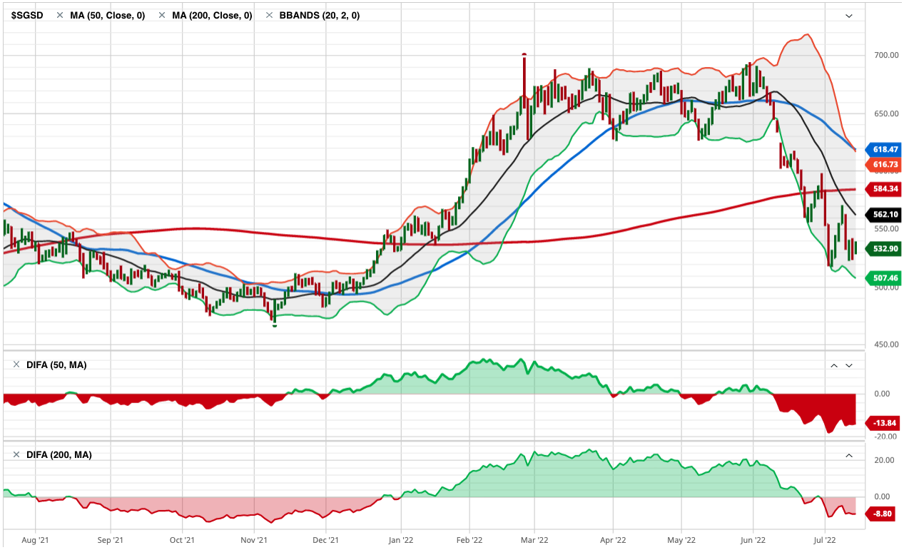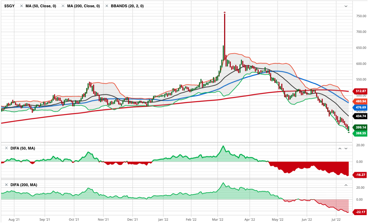 S&P GSCI Sugar Index is in a non-trending, volatile period over the past year, and it’s right at the 50 and 200-day average.