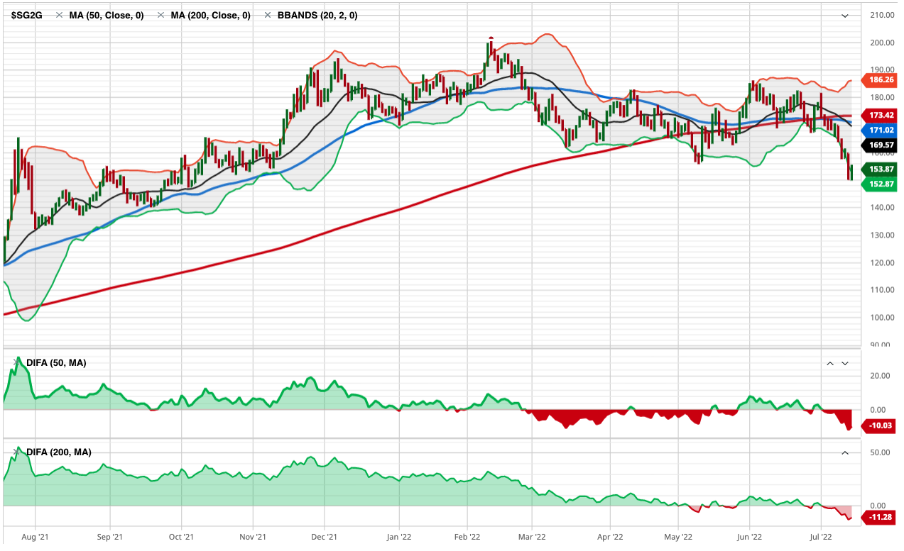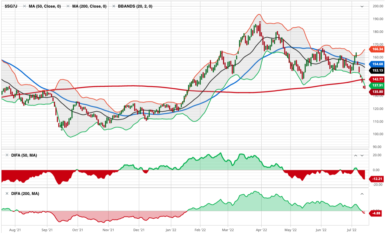 Coffee is in a downtrend. S&P GSCI Coffee Index is below the 50 and 200 average, signaling it’s in both a short-term and intermediate-term downtrend. This may help explain why Latin American countries like Brazil’s stock index is down, too. Latin America makes a lot of the world’s coffee.