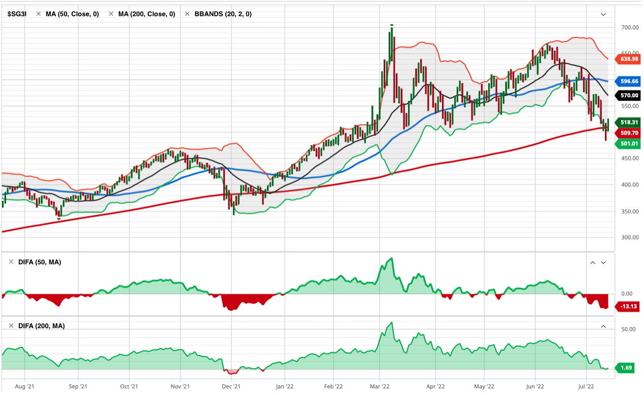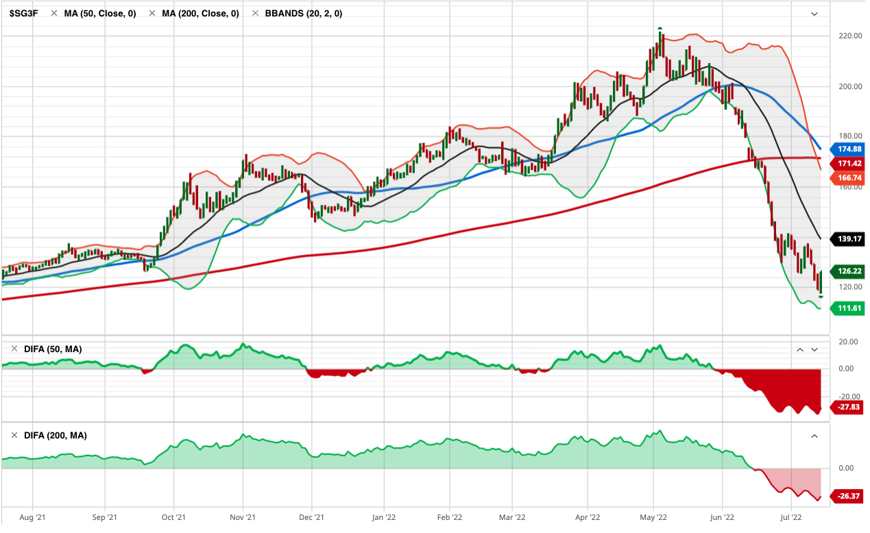 S&P GSCI Natural Gas Index is in a primary uptrend, but recent downtrend in the short term. It tapped its 200-day average and is trending back up, but nearly 7% below where it was three months ago.