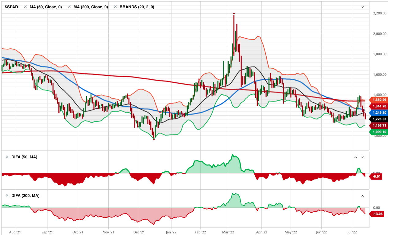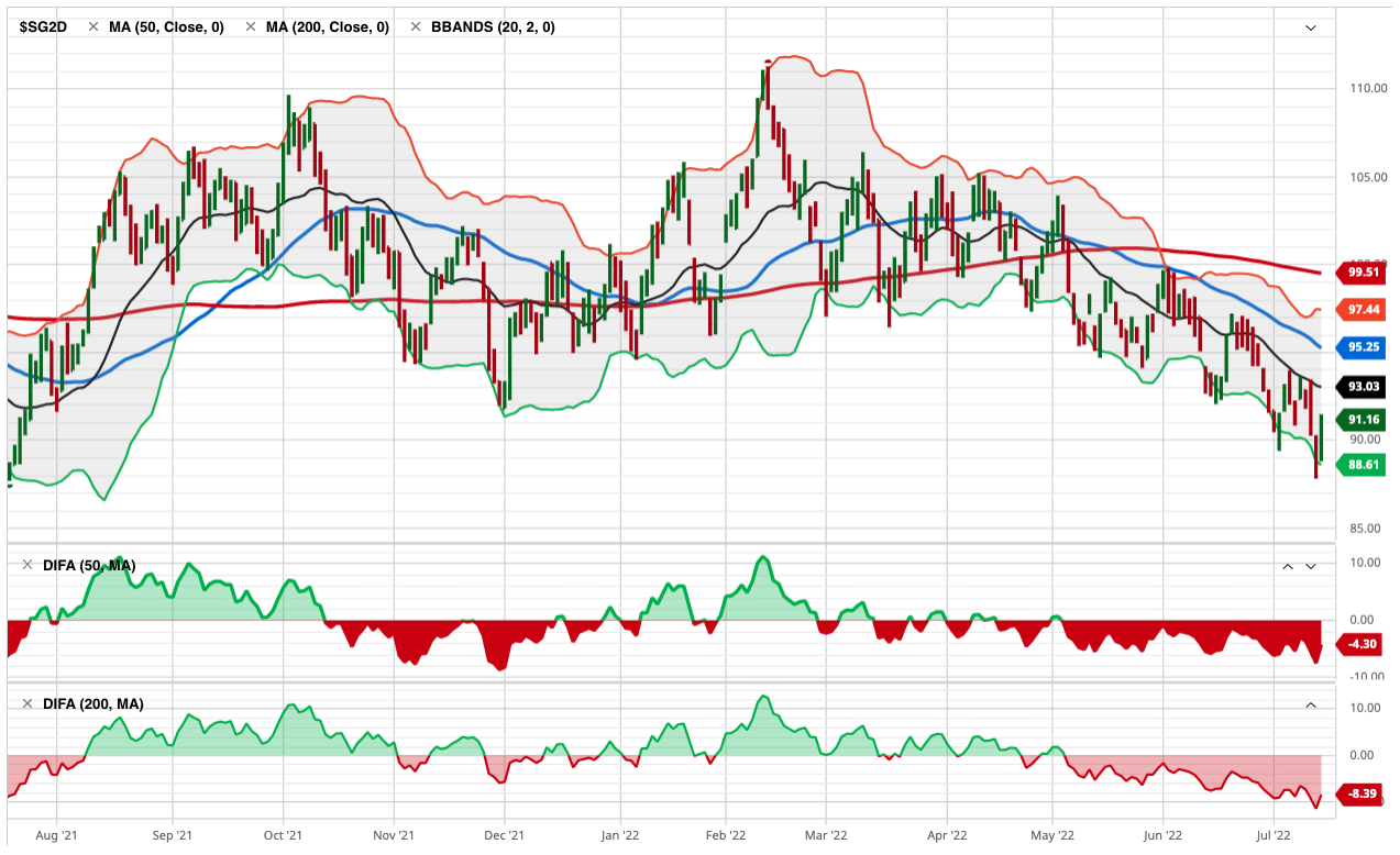 S&P GSCI Industrial Metals Index shows industrial metals are in a downtrend with great momentum.
