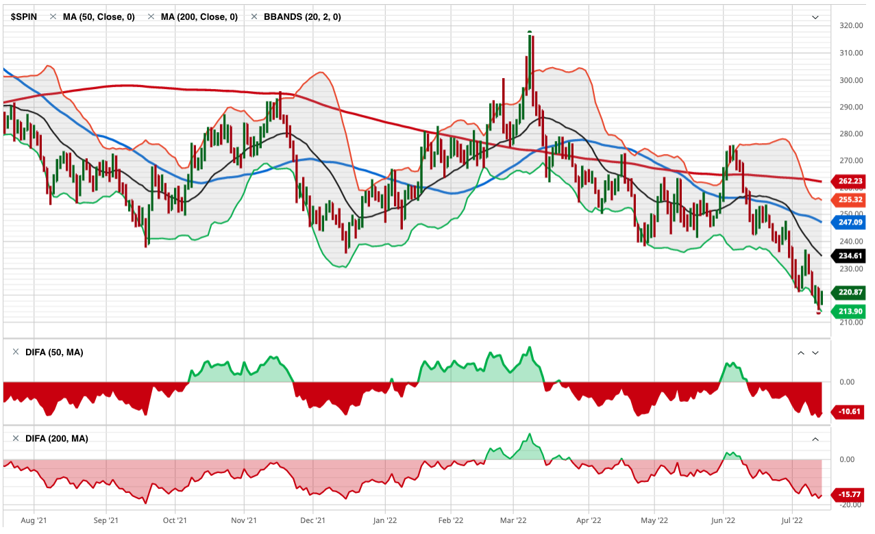 Here’s where the weakness in these commodities trends begins. The S&P GSCI Gas Oil Index is in an intermediate-term uptrend; It’s 20% above the 200-day average. But the recent decline pushed it 6% below the 50-day average. The Gas & Oil index is in a primary uptrend, but short-term pullback. Longer-term trends begin with a shorter-term trend, so we’ll see how it trends from here.