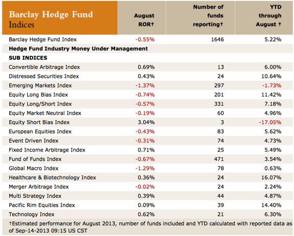 As you can see below, the Barclay Hedge Fund Index, which is the average return of all hedge funds in the Barclay database, has gained 5.22% year to date through August. Is 5.22% a “poor” return when the risk free rate on short-term T-Bills, money markets, and CD’s are near zero? I don’t think so. But, if you compare it to the highest returning index you can find maybe you’ll perceive it as “poor”. For example, the stock market indexes are so far “up” double digits this year, but they can reverse back down and end the year in the red. Stock indexes are long-only exposure to stocks so their results reflect a risk premium earned for owning stocks with no risk management to limit the downside. I don’t know anyone who thinks the stock indexes have created the kind of risk adjusted return they want after declining more than -50% twice the past several years. If they want to compare “hedge funds” to a long-only stock index they should consider focusing on hedge funds that focus on stocks.