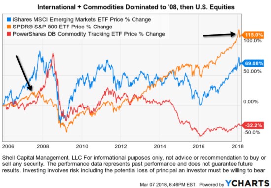 So, I can tell you the bull market 2003-07 was a regime of rising commodities, foreign currency, and international producers of commodities. In this bull market, U.S. equities have dominated. We can see that in the chart below. If your exposure up until 2008 was only U.S. stocks, you would be disappointed as Emerging Markets countries like China and Brazil were much stronger as was commodities. We can also see how those markets have lagged since the low in 2009.