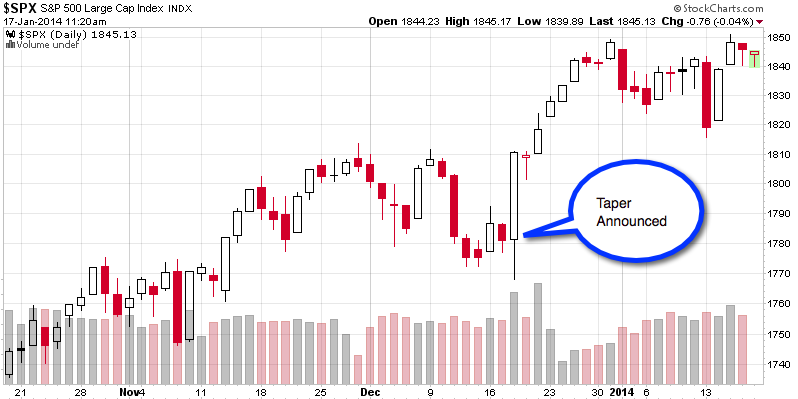 Later that day, the Fed announced that it would indeed begin to “taper” its bond-buying program. Although, The Federal Reserve’s $10 billion taper announcement doesn’t seem a significant cut in the central bank’s massive bond-purchasing plan. It’s still a taper and a taper is what those who talk on TV and write about it seemed to be afraid of. In fact, I mentioned in Fear is beginning to drive stock trends that investor sentiment measures shifted to fear and prices had dropped about -3% leading up to the Fed announcement. It seemed the market had anticipated some negative news and their fear “priced it in”.