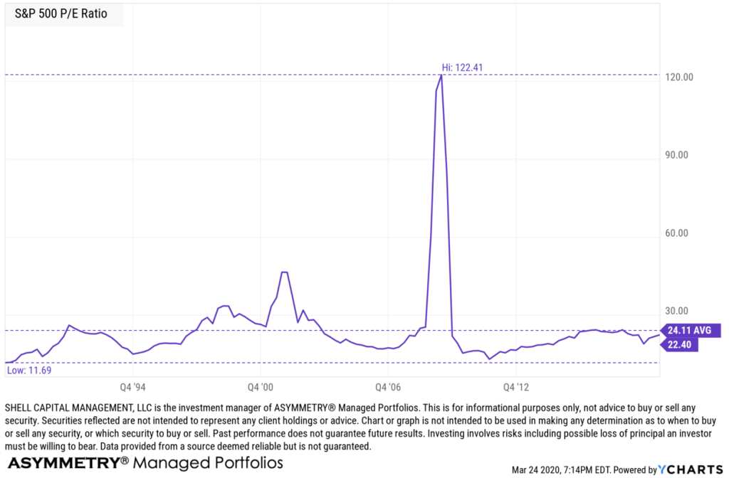 Another way to observe valuations of the big picture is the S&P 500 PE Ratio. The S&P 500 PE Ratio is the price to earnings ratio of the constituents of the S&P 500. The S&P 500 includes the 500 largest companies in the United States and can be viewed as a gauge for how the US stock market is performing. The price to earnings ratio is a valuation metric that gives a general idea of how a company’s stock is priced in comparison to their earnings per share. Historically, the S&P 500 PE Ratio peaked above 120 during the financial crisis in 2009 and was at its lowest in 1988. I marketed the high, low, and average in the chart.