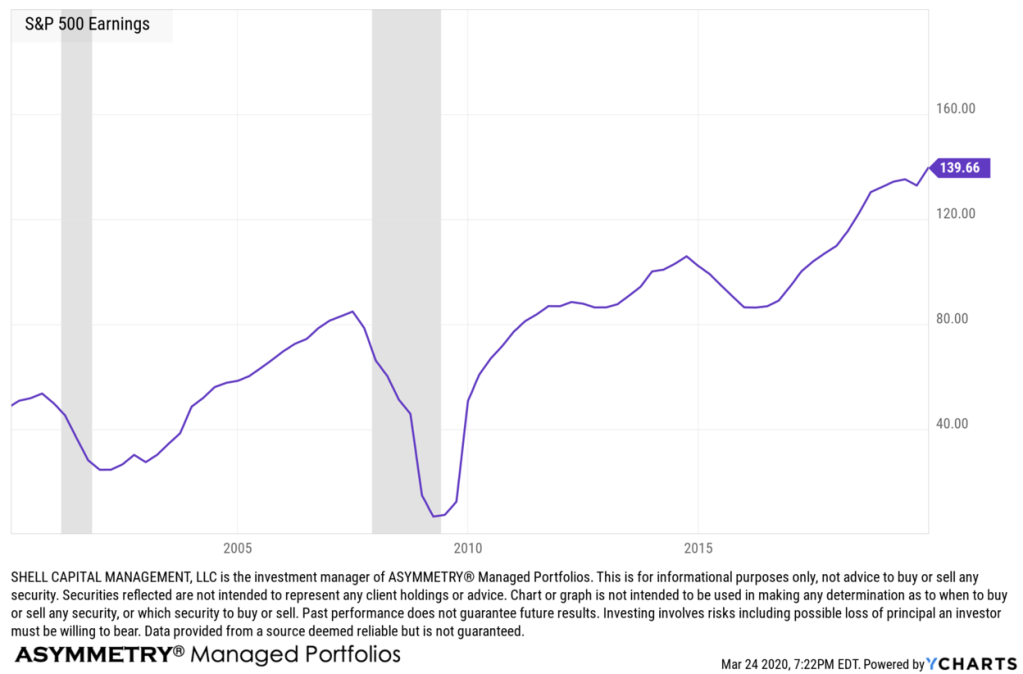 The trouble is, this PE metric did skyrocket in the last bear market. It’s because in recessions and bear markets, earnings decline. A picture is worth a thousand words, so here is the S&P earnings over the last twenty years with the recessionals in gray.