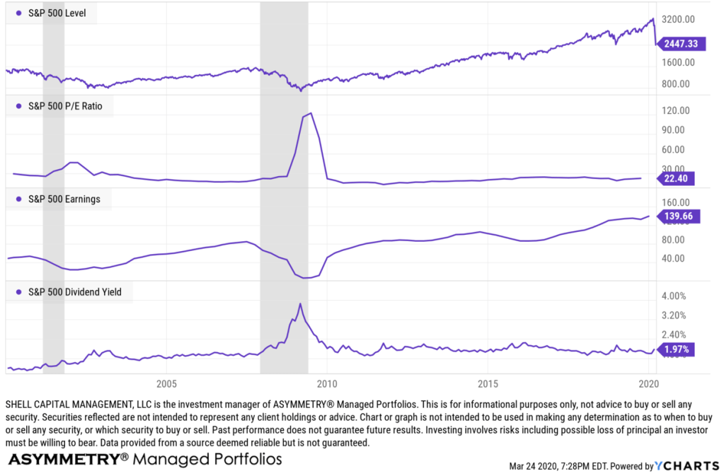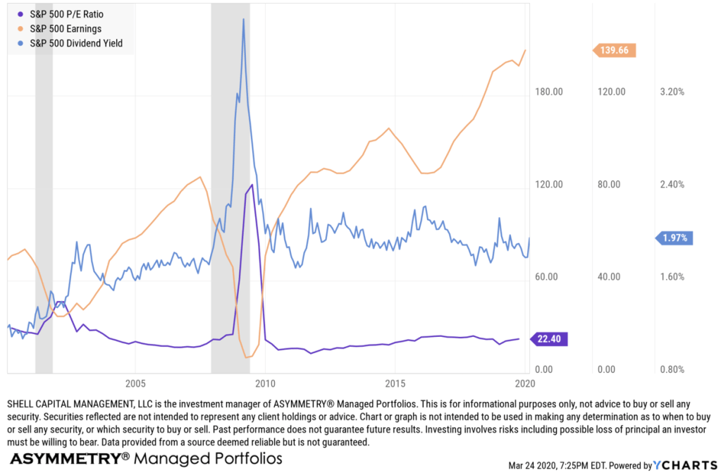 It all makes more sense when we see all three of the stock market return drivers in one chart. Earnings fall, price falls, dividend increases as the price decrease, and PE spikes up.