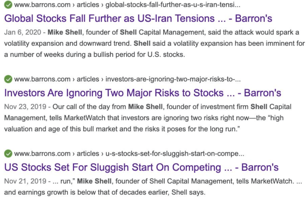 As a matter of fact, I was quoted three times in Barron’s and MarketWatch in November 2019 and January 2020 warning of the elevated risk level in stocks because of their valuation, the length of the bull market that is 11 years old, and what was a very low level of volatility.