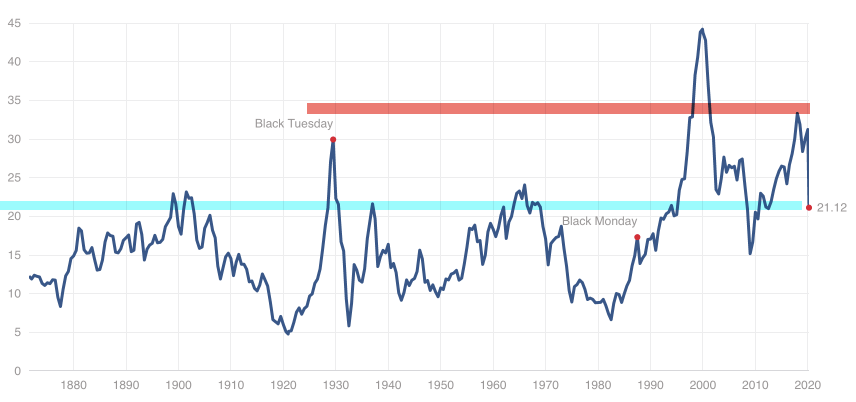 This price-earnings ratio is based on average inflation-adjusted earnings from the previous 10 years, known as the Cyclically Adjusted PE Ratio (CAPE Ratio), Shiller PE Ratio, or PE 10.