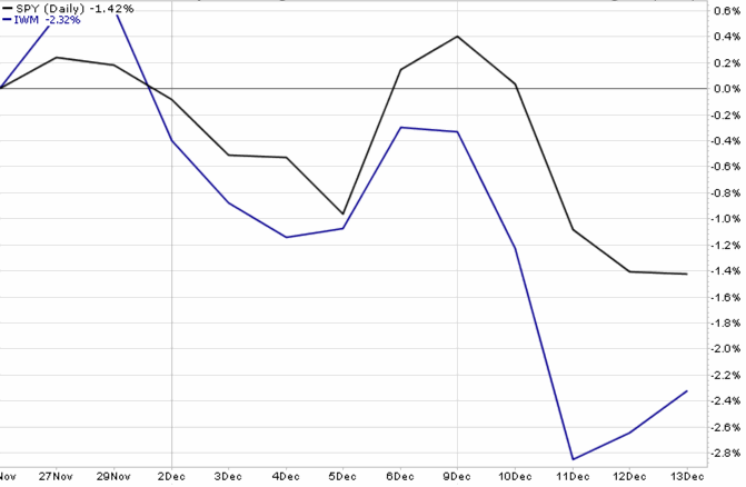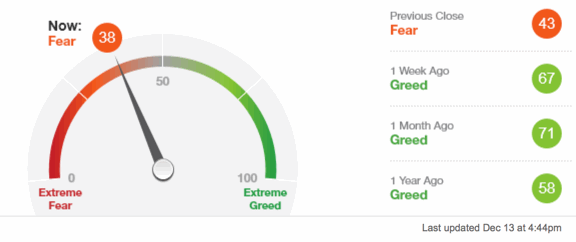 Since I pointed out that “Investors are Complacent” on November 27th, the S&P 500 index of large company stocks has declined -1.4% and the Russell 2000 small company stock index more than -2%. Both are small declines so far, but it was enough to shift the return driver from Extreme Greed in early November to Fear as of the close on Friday.