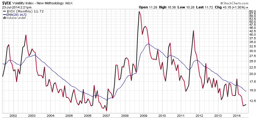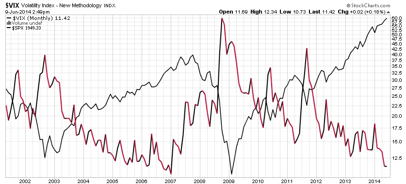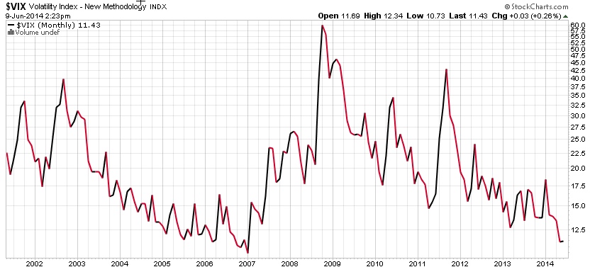 Clearly, investors who don’t like volatility had a very difficult time holding the stock market up until recently. The past decade has shown us material changes in volatility from the low and decreasing period pre-2008 to the extreme high volatility up until late 2013. Some investors may now even be thinking of getting “more aggressive”, now that the wide price swings have become a distant memory. But you may consider that low volatility is a sign of less indecision. After prices trend up for years, investors become more complacent and therefore volatility declines. Just as we saw in 2007, we shouldn’t be surprised to see volatility very low at the price peak.