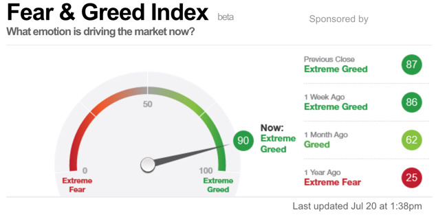 Indicators suggest that investors are pursuing higher risk strategies and that investor optimism has reached a short-term extreme. I like to use the Fear & Greed Index that is a simple snapshot for anyone to see. Below is the reading as of yesterday as it reached “Extreme Greed.”