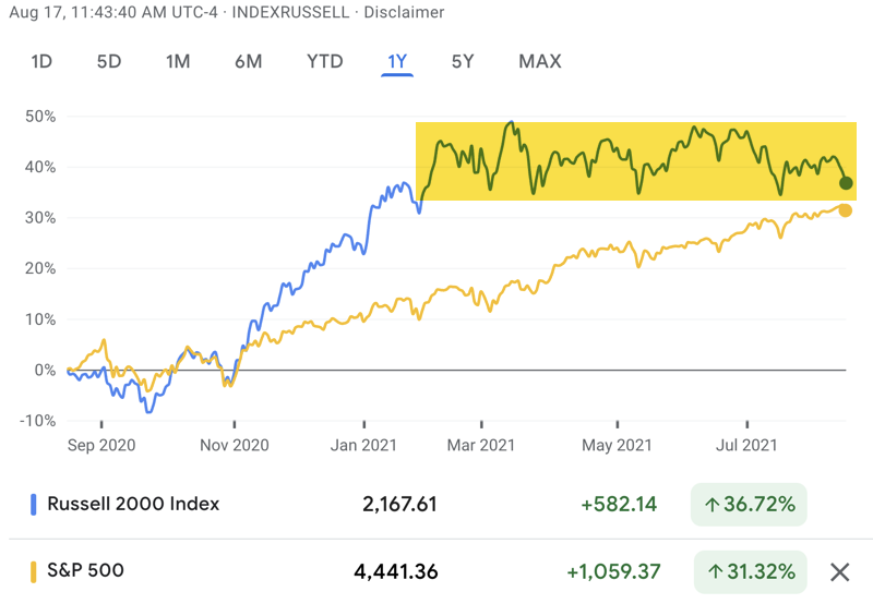 However, that has not been the case since the small stock index peaked in March. As I highlighted in yellow, the Russell 2000 has been drifting sideways into a five month long base without a breakout.