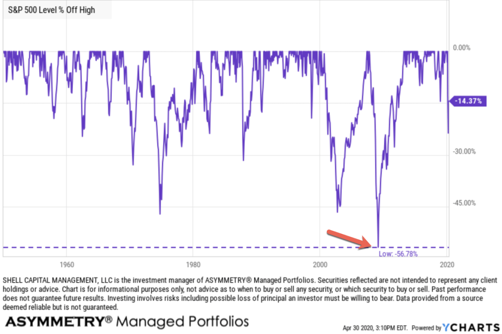 Next, we look all the way back to the beginning of the index data to observe its historical downside. The 1926 era Great Depression was by far the worst when the Dow Jones Industrial Average fell over -75%. It makes the 2007-09 period when it fell -50% look tame.