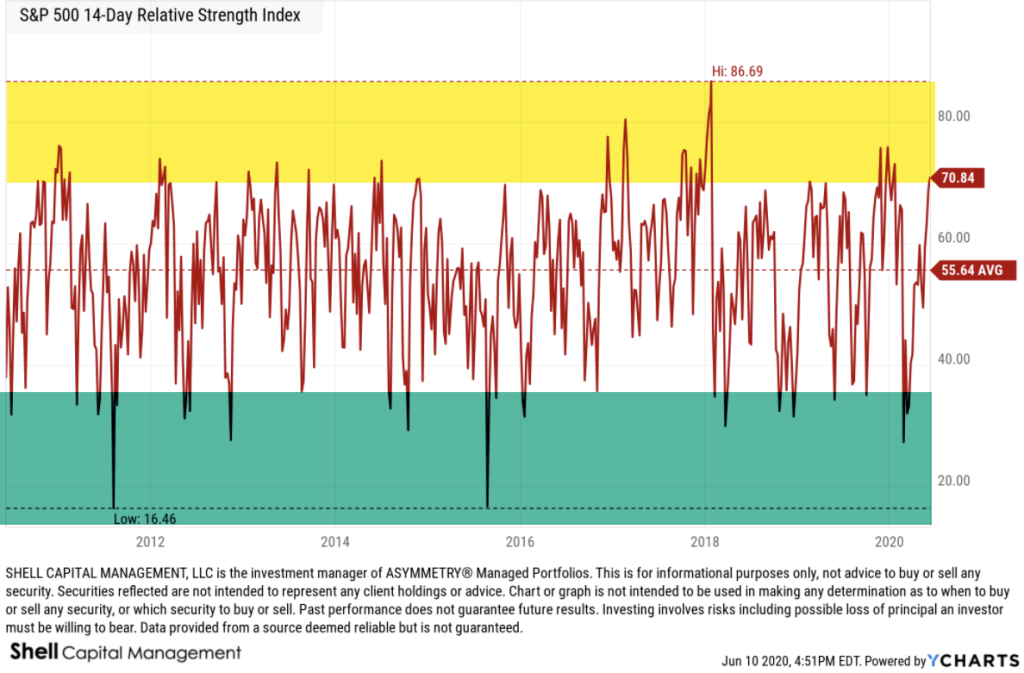 The S&P 500 Equal Weight, which gives an equal weighting to all 500 stocks instead of more exposure to the largest companies based on capitalization, crossed above its 200-day average but was reaching an overbought level at the same time.