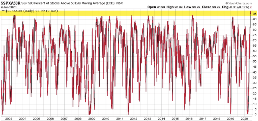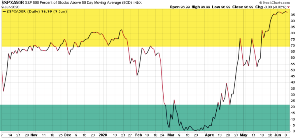 The percent of S&P 500 stocks trending above the 50-day average has quickly trended up to the red zone.