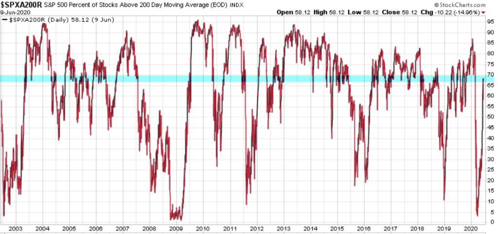 From the broad index like the S&P 500 it’s useful to look inside to see the percentage of stocks that are trending above their 50-day and 200-day averages to gauge the strength of participation in the uptrend.