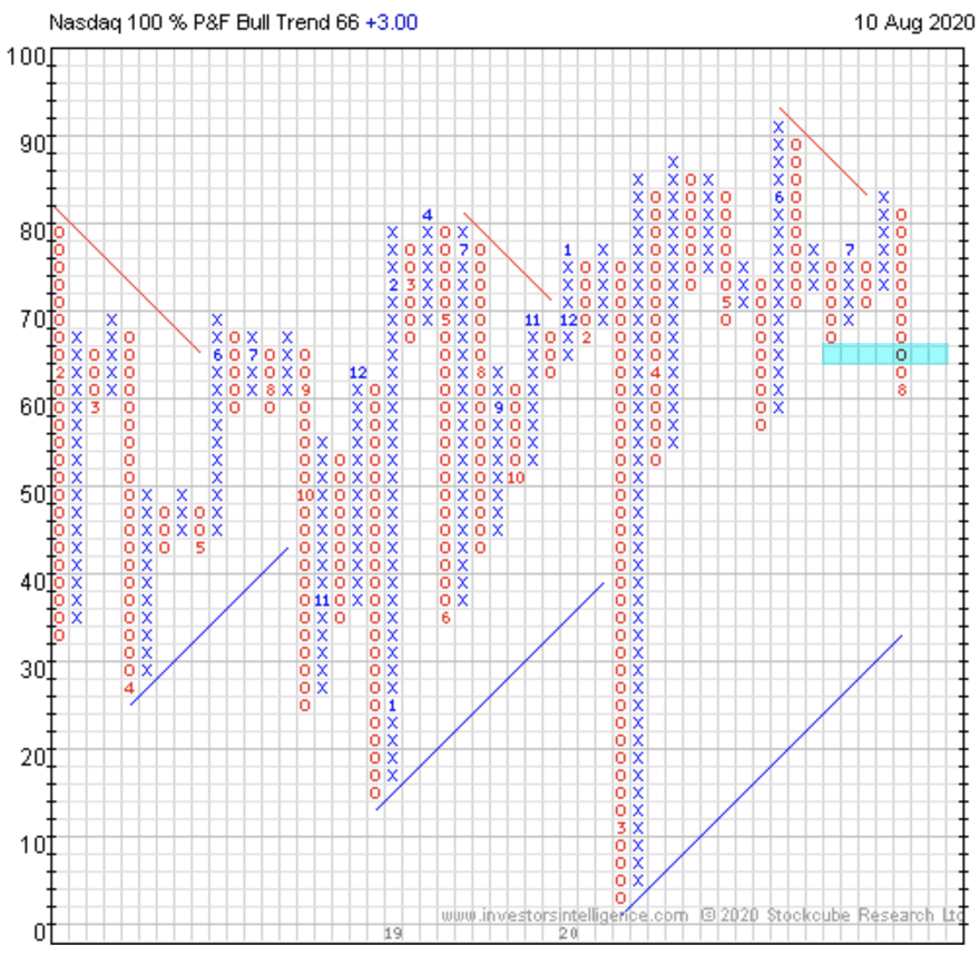 At the recent high, 60% of the stocks in the index were trending above their 200-day average and about 80% of the stocks were trending above their 50-day average, both of which have now turned down as an increasing number of stocks are trending down.