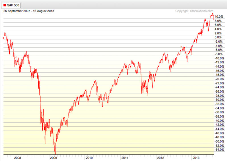 The next chart overs a full market cycle (a bear market and then bull market) for the S&P 500 stock index from 2007 to 2013. Even with the strong recovery off the low, the stock index achieved only a 10% return over the period but experienced a -56% decline along the way.